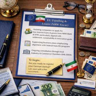 Ein iranisch-deutsches Beratungs- und Dienstleistungsunternehmen unterstützt iranische KMU, Unternehmer und Fachleute aus der Industrie bei der Gründung, Expansion und dem Erfolg in Deutschland und der EU. Wir bieten rechtliche Unterstützung, Bankgeschäfte, Finanzierung und Unterstützung für Innovationszentren – alles aus einer Hand.